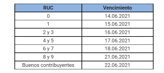 La declaración jurada se efectuará únicamente mediante Sunat Virtual con la presentación del Formulario Virtual 3560 – Declaración Juraday conformeal cronograma establecido por la entidad recaudadora para obligaciones del periodo mayo que vencen entre 14 y 22 de junio de 2021, según el último dígito del RUC.