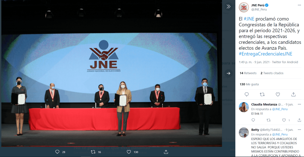 También como el almirante José Cueto por Renovación Popular: »Solo quiero que sepan que gracias a las FFAA recuperamos la paz que asesinos como sendero luminoso y MRTA». En la foto el segundo de izquierda a derecha.