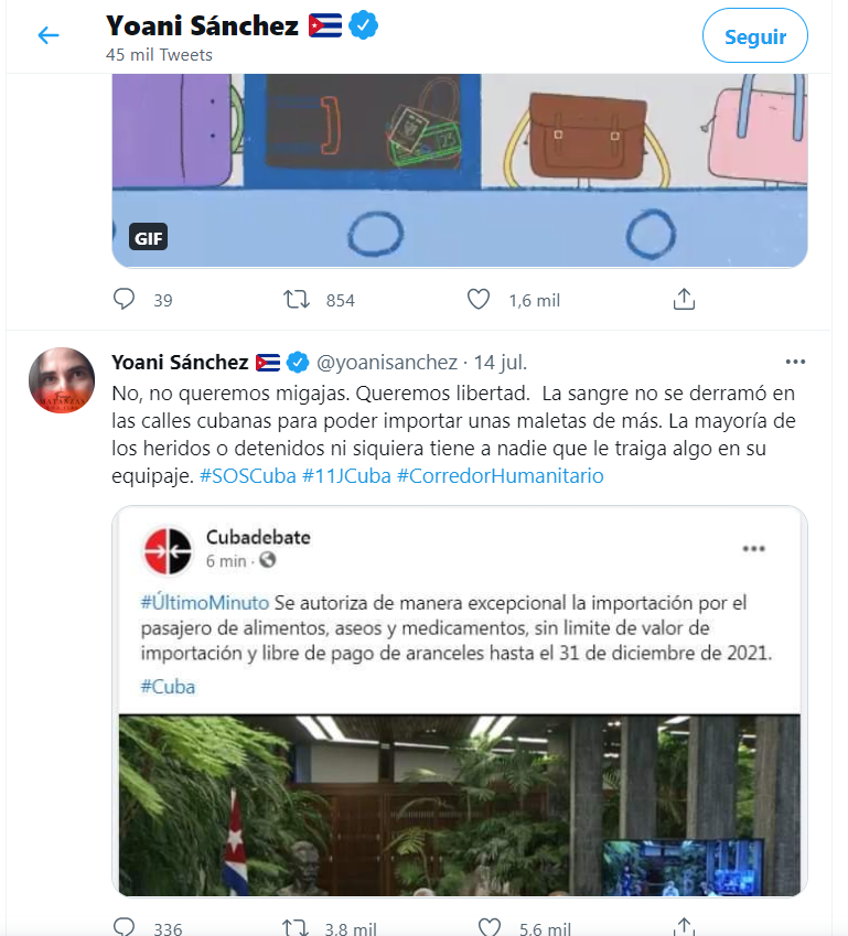 La conocida filóloga, periodista y activista por la libertad de Cuba, Yoani Sánchez, publicó respecto a la medida del levantamiento de aranceles y límites a la importación privada de comida y medicinas: