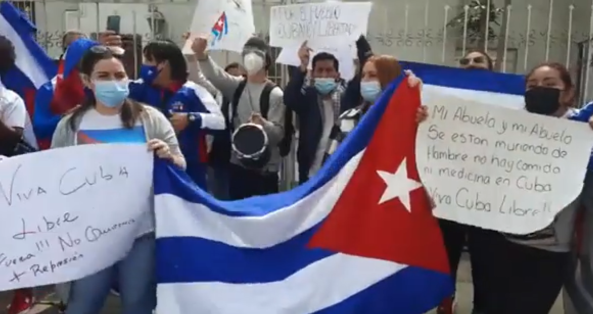 Junto con muchos ciudadanos en el mundo que protestan en respaldo contra la dictadura en Cuba, en Perú, se reunieron para manifestarse frente a la embajada de ese país ubicada en la calle Choquehuanca 135, en el distrito de San Isidro.. Dictadura que trae injusticia, pobreza económica y desastroso servicio de salud, y desde el inicio de la pandemia, la situación es aún más grave.