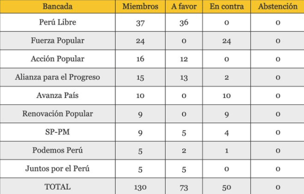 La bancada del partido Alianza para el el Progreso del líder fundador César Acuña, que votó a favor del voto de confianza al gabinete Bellido, adujo que fue »por la gobernabilidad y que no significa dar un cheque en blanco».