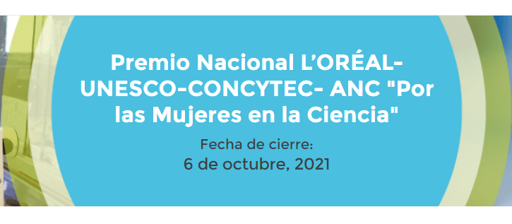 El programa Prociencia, unidad ejecutora del Concytec, convoca a científicas peruanas a participar en el Premio Nacional L’oréal-Unesco-Concytec-ANC «Por las Mujeres en la Ciencia», el cual propone estimular, reconocer e incentivar el liderazgo y la trayectoria comprobada en actividades de CTI desarrollada por la mujer investigadora peruana, destacada a nivel nacional o internacional.