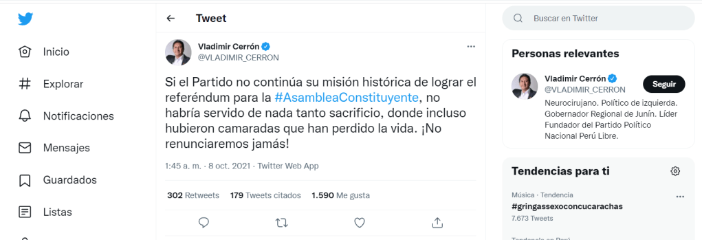 Gobierno de Pedro Castillo recolecta firmas de ciudadanos para Asamblea Constituyente a través de Perú Libre: De la propia voz del Secretario General del partido, Vladimir Cerrón. ¿Los demócratas de cualquier sector han firmado #NoAlaAsambleaConstituyente de Ghersi?: