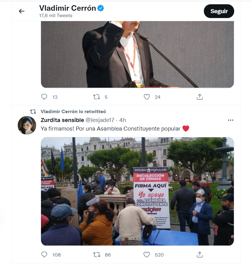 Gobierno de Pedro Castillo recolecta firmas de ciudadanos para Asamblea Constituyente a través de Perú Libre: De la propia voz del Secretario General del partido, Vladimir Cerrón. ¿Los demócratas de cualquier sector han firmado #NoAlaAsambleaConstituyente de Ghersi?: