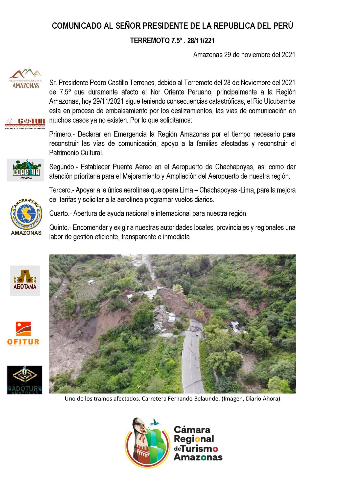 Debido al terremoto del domingo 28 de noviembre, en Amazonas,, la Cámara Regional de Turismo de Amazonas (Caretur) a través de un comunicado dirigido al presidente Pedro Castillo Terrones solicitó declarar en emergencia a la región para centrar los esfuerzos en la reconstrucción de vías de comunicación y apoyo a las familias afectadas.