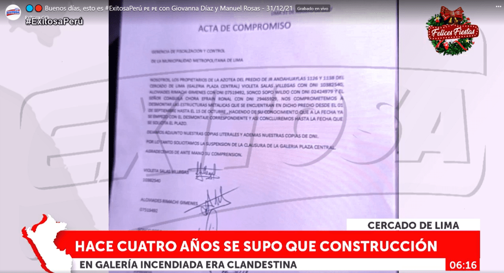 La agresión e impedimento a periodista para ejercer su trabajo por parte de funcionarios (seguridad y prensa) de la Municipalidad de Lima para consultarle al alcalde de Lima, Jorge Muñoz, por la responsabilidad del incendio en Mesa Redonda con documento en mano sobre el reconocimiento de construcciones clandestinas en galería comercial desde el 2017 y que en febrero 2021 hubo fiscalización en la gestión del alcalde de la comuna limeña en la galería siniestrada que confirmaba que del piso del 4 al 6 eran construcciones ilegales el alcalde. Antes del episodio de agresión y obstrucción al trabajo del periodista, respondió que la pregunta no era pertinente. A su turno, la gerenta de Fiscalización de la Municipalidad de Lima, brindó información y sostuvo que cumplieron con el proceso de fiscalización según especifica la ley y que cumplir ya estaba en el ámbito de los infractores. Del minuto 2:14:18. En el minuto 31:03 se pronuncia Pablo Goytizolo, representante de la Cámara de Empresarios de Mesa Redonda, quien responsabilizó al alcalde de Lima por no realizar una rigurosa fiscalización.