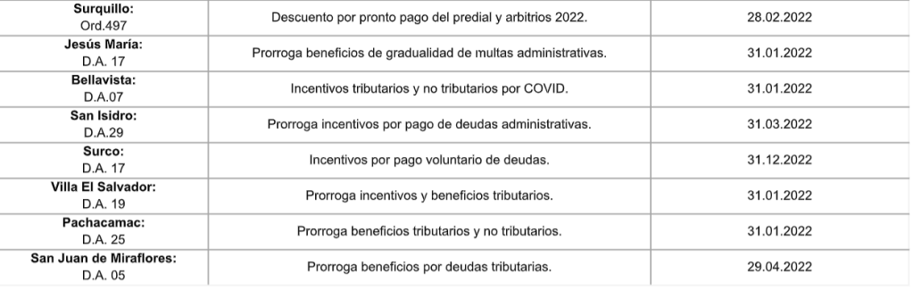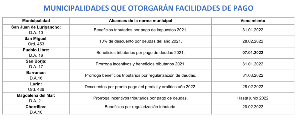 Las municipalidades que darán estas facilidades tributarias son: San Juan de Lurigancho, San Miguel, Pueblo Libre, San Borja, Barranco, Lurín, Magdalena del Mar, Chorrillos, Surquillo, Jesús María, Bellavista, San Isidro, Surco, Villa El Salvador, Pachacamac y San Juan de Miraflores.