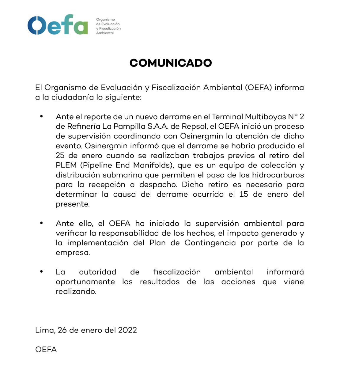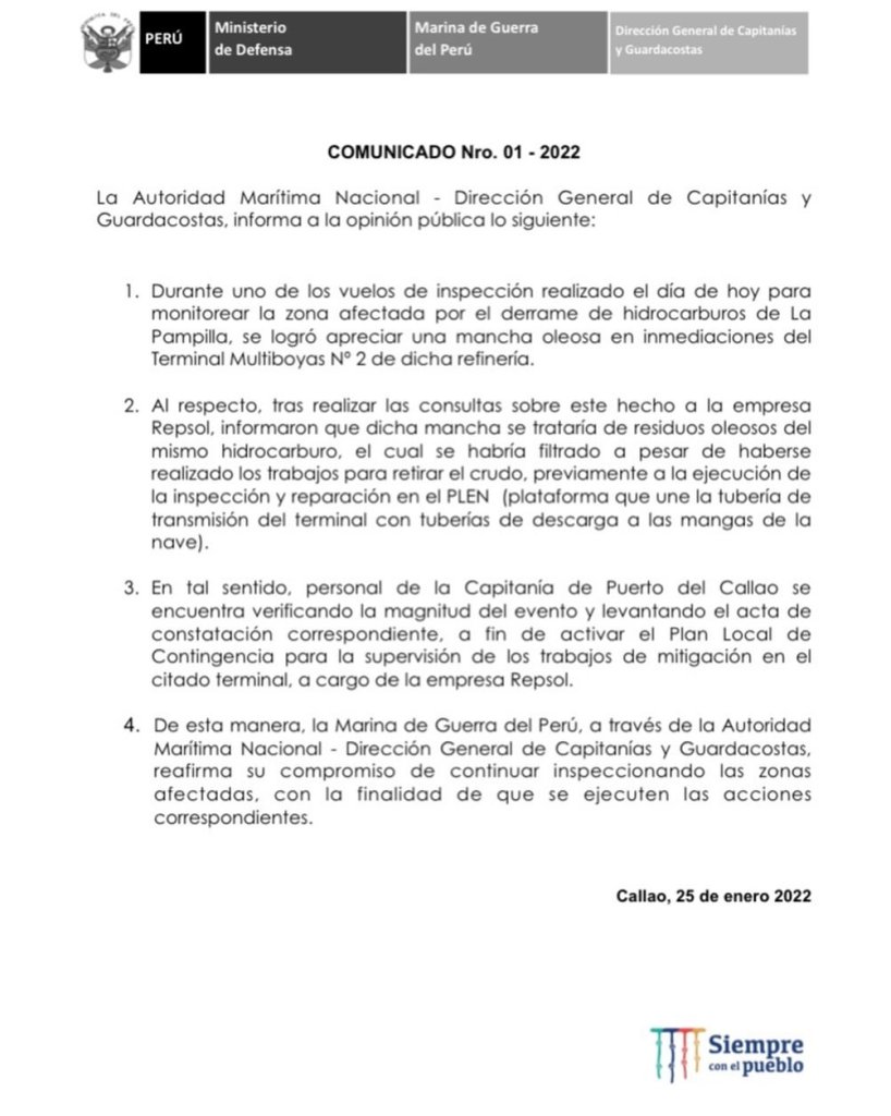 La Dirección General de Capitanías y Guardacostas de la Marina de Guerra del Perú, DICAPI, comunicó respecto a un segundo derrame de petróleo de Repsol, en el documento Comunicado Nro. 01-2022 publicado el martes 25 de enero 2022 muy cerca a la medianoche 23:39