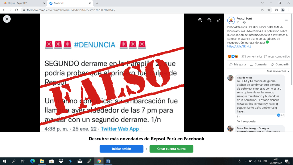 Comunicado de Repsol en el que descartan segundo derrame de petróleo en Ventanilla en su cuenta en Facebook publicado el martes 25 de enero 2022 a las 20:17: »DESCARTAMOS UN SEGUNDO DERRAME de hidrocarburos. Advertimos a la población sobre la circulación de información falsa e invitamos a conocer el avance diario en las labores de recuperación». Al día siguiente miércoles 23 de enero 2022 a las 10:30 hicieron la publicación
