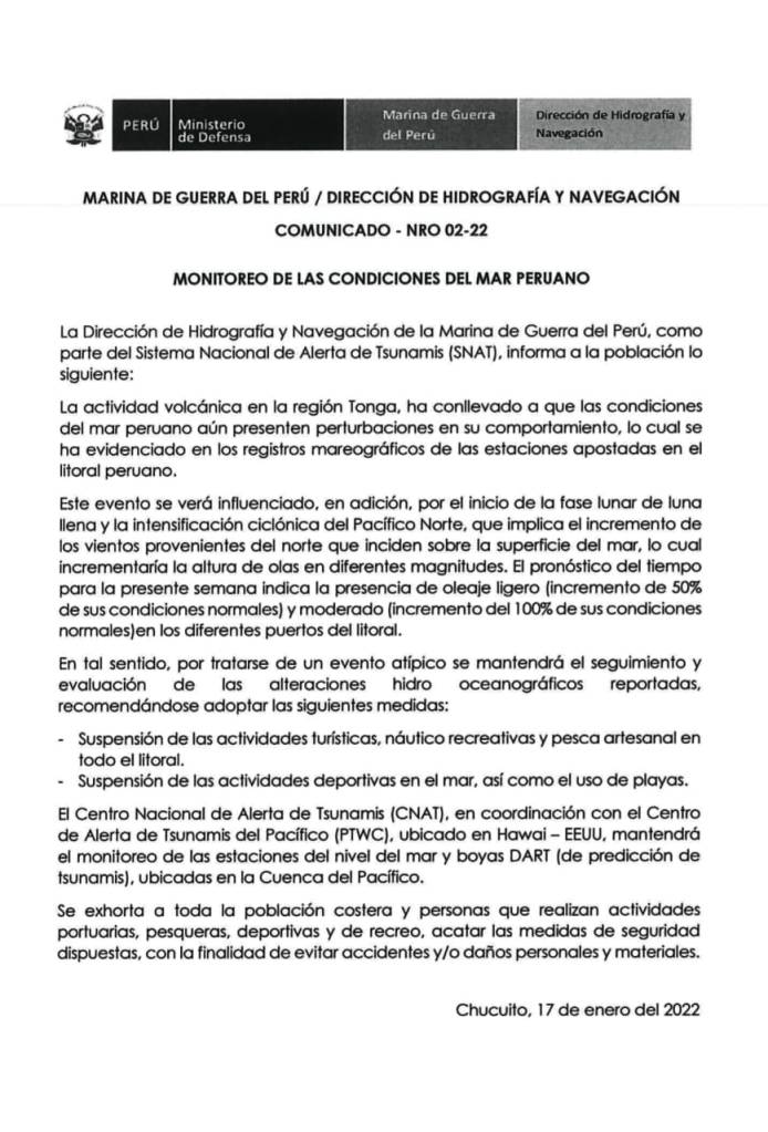 La Marina de Guerra del Perú dio alerta de oleaje anómalo tres días después de explosión de volcán en Tonga y dos días después del derrame de petróleo en Ventanilla. El mismo sábado 15 de enero 2022 día del derrame de petróleo en Ventanilla ocurrido antes de las 18 horas o 6 de la tarde según señala Repsol, al día siguiente de la erupción del volcán en Tonga (2:37 am. 14 de enero 2022), la autoridad marítima peruana, entre otras publicaciones con el mismo mensaje, desestimó en su publicación, también en su cuenta de Facebook a las 21:52 que el fenómeno natural ocasione alerta de tsunami en las costas peruanas.