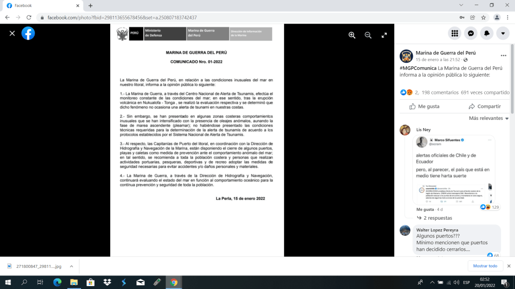 Incluso el comunicado NRO 01-22 igualmente a través a través de la Dirección de Hidrografía y Navegación el domingo 16 de enero señala en el segundo párrafo: Según lo reportado hoy a las 15:24 horas por el Centro de Tsunamis del Pacífico (PTWC) …esto podría interpretarse como una posible nueva actividad volcánica en Tonga, la cual aún no se encuentra confirmada… fue publicado en su cuenta de Facebook a las 22:28