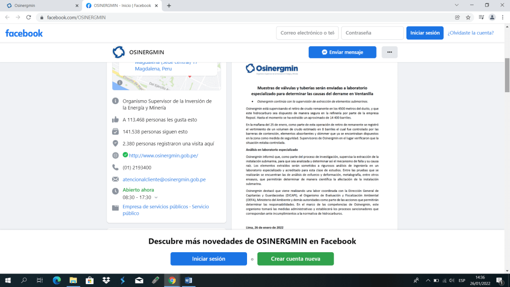 Comunicado de Osinergmin, Organismo Supervisor de la Inversión en Energía y Minería, publicado el miércoles 26 de enero 2022: