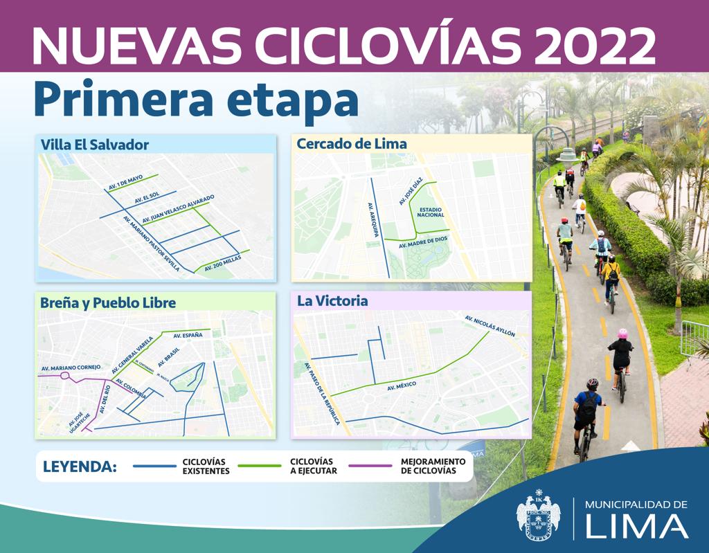 En mayo estas obras inician la construcción de más de 20 km de ciclovías, que favorecerán la intermodalidad con la Línea 1 del Metro y el Metropolitano. Así, los ciudadanos podrán llegar a mercados, centros de salud, de estudio y laborales, bancos, centros comerciales, entre otros.