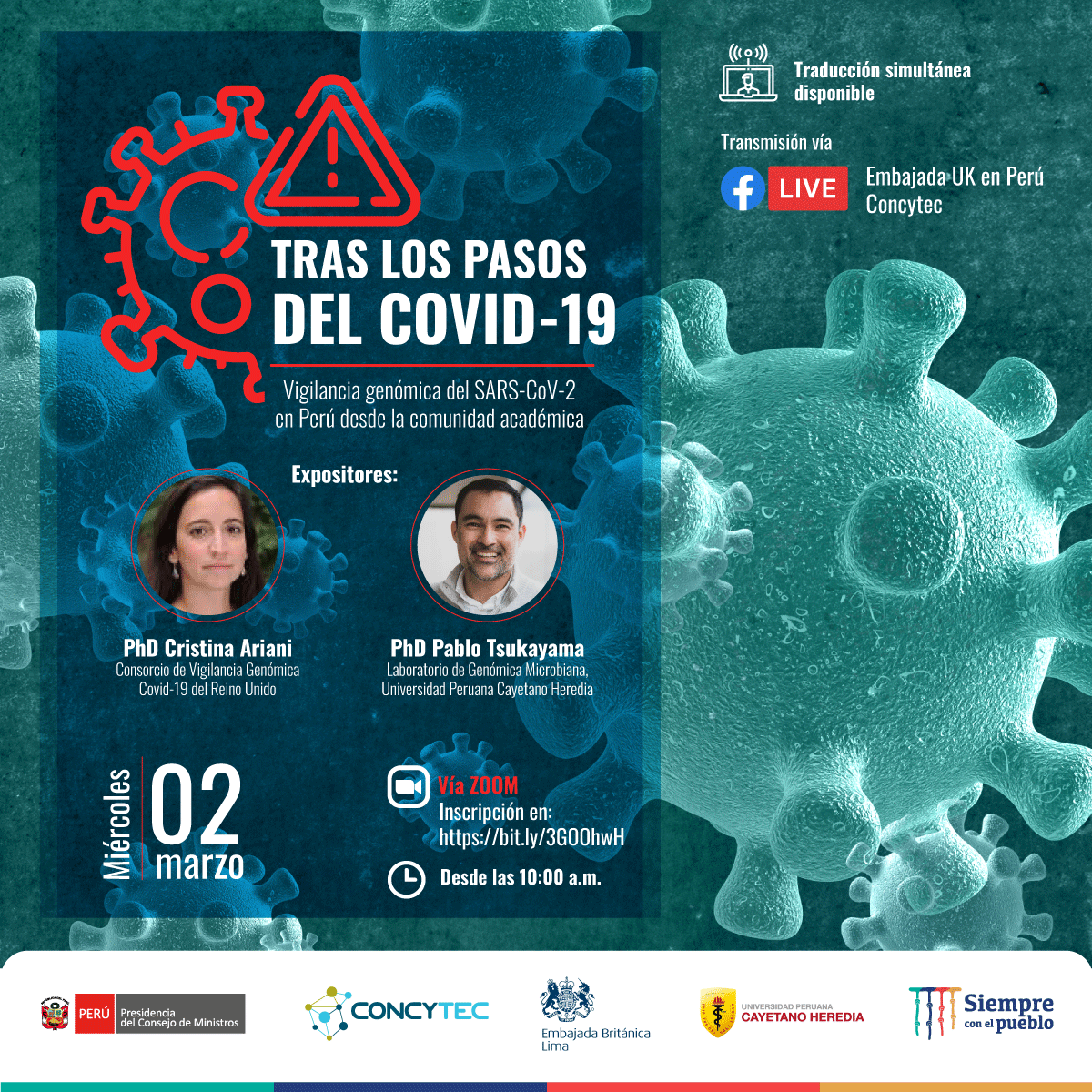 Los resultados de dos proyectos de vigilancia genómica del virus causante de la pandemia en Perú, liderados por Pablo Tsukayama, PhD del Laboratorio de Genómica Microbiana de la Universidad Peruana Cayetano Heredia (UPCH), serán presentados en el evento virtual “TRAS LOS PASOS DEL COVID-19: Vigilancia genómica del SARS-CoV-2 en Perú desde la comunidad académica”, con la financiación del Consejo Nacional de Ciencia, Tecnología e Innovación Tecnológica (Concytec). la Embajada Británica en Perú, y varias instituciones.