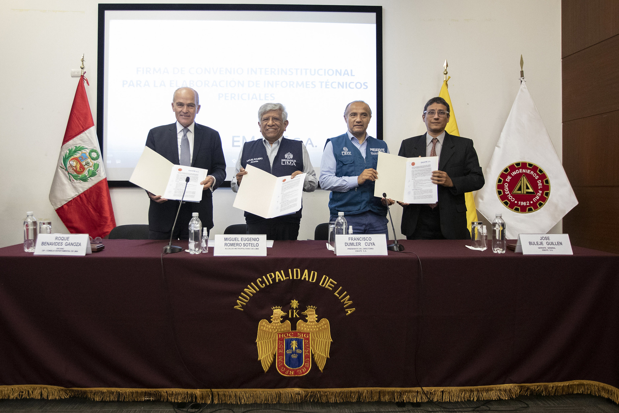 El Colegio de Ingenieros del Perú (CIP) garantizará la calidad de las obras en los próximos dos años que desarrollará la Municipalidad de Lima, a través de Emape, Empresa Municipal Administradora de Peaje de Lima, a través del convenio suscrito entre estas dos instituciones en presencia del alcalde de Lima, Arq. Miguel Romero Sotelo, y el decano del CIP- CD Lima, Roque Benavides.