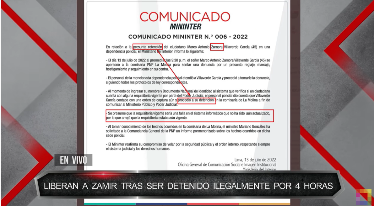 Liberan a Zamir Villaverde. Comunicado del Ministerio del Interior de Perú, MININTER, N 006-2022: Si fuese falla en el sistema informático judicial, los funcionarios hubiesen llamado a la Fiscalía y confirmar la situación del supuesto requisitoriado que un día antes fue excarcelado en su condición de colaborador eficaz y por supuesto que tuvo cómo acreditar. El 18 de julio Villaverde tiene que declarar y presentar más pruebas en la Fiscalía.