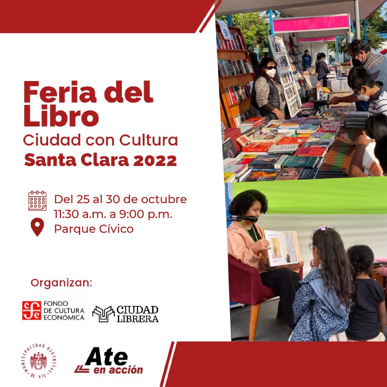 Por primera vez llega la feria del libro Ciudad con Cultura al distrito de Ate. El Fondo de Cultura Económica y Ciudad Librera, en alianza con la Municipalidad de Ate organizan la Feria del Libro Ciudad con Cultura Santa Clara 2022; evento que trae consigo una gran oferta editorial y múltiples actividades culturales gratuitas para toda la familia.