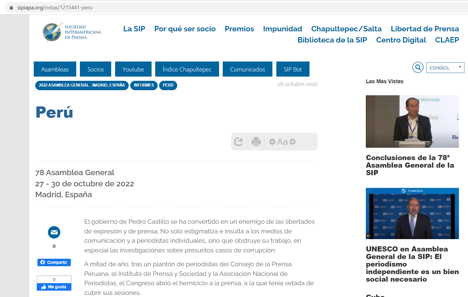 El gobierno de Pedro Castillo se ha convertido en un enemigo de las libertades de expresión y de prensa es la afirmación introductoria del Informe de la Sociedad Interamericana de Prensa sobre Perú en su Asamblea General edición número 78 realizada en Madrid, España.