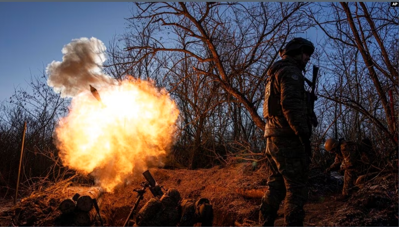 Militares ucranianos disparan un mortero de 120 mm hacia posiciones rusas en la línea del frente cerca de Bakhmut, región de Donetsk, Ucrania, el miércoles 11 de enero de 2023. (Foto AP/Evgeniy Maloletka) en Voice of America.