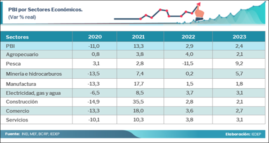 Según estimaciones del Instituto de Economía y Desarrollo Empresarial (IEDEP) de la Cámara de Comercio de Lima (CCL), la economía peruana registraría una desaceleración el 2023, pues lograría un crecimiento de 2,4%, cifra menor a lo registrado en el 2022 (2,9%), pese a la expansión que se estima para el sector Minería e Hidrocarburos de 5,7%, rubro que aportó el 11,6% del PBI del 2021 y que es afectado constantemente por protestas y ola de violencia en el país, manifestó el jefe del Iedep de la CCL, Óscar Chávez.