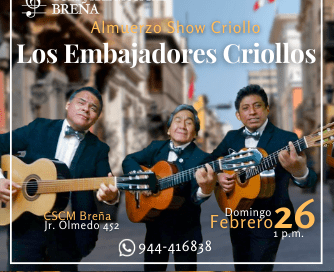 El almuerzo show artístico contará también con la participación del “Conjunto Musical Criollos del Perú” que interpretará clásicas canciones del Conjunto Fiesta Criolla, dúo Zambo Cavero y Óscar Avilés, y el Centro Musical Unión. En el 2020 la agrupación es nombrada por el Ministerio de Cultura como Punto de Cultura.