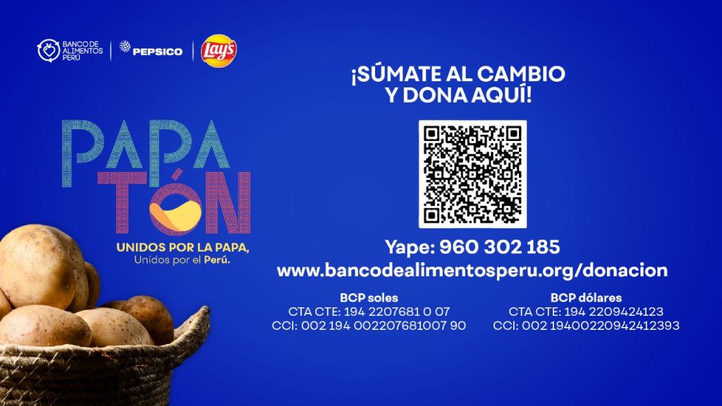 Organizada por PepsiCo y su marca Lay’s, en alianza con el Banco de Alimentos Perú (BAP), esta edición de la Papatón ayudará a la producción y consumo de alimentos locales, apoyando la economía de los agricultores de Huánuco y la alimentación de miles de familias peruanas de las ollas comunes, comedores populares, albergues y otras asociaciones de la comunidad del BAP.