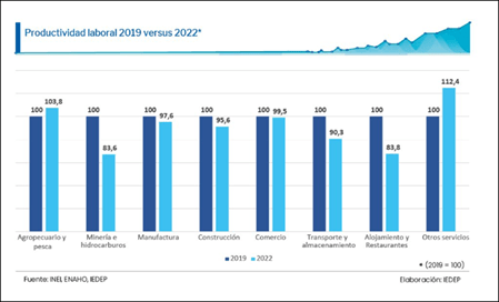 Entre 2022 y 2019, la productividad laboral registró retrocesos en seis de ocho actividades económicas que componen el PBI, los que aún no logran superar el nivel prepandemia. Estos son Minería e Hidrocarburos (-16,4 %), Manufactura (-2,4 %), Construcción (-4,4 %), Comercio (-0,5 %), Transporte y Almacenamiento (-9,7 %) y Alojamiento y Restaurantes (-16,2 %).