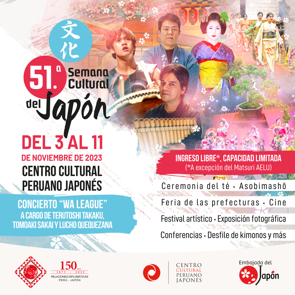 La Semana Cultural del Japón en su edición 2023 que va hasta el 11 de noviembre enmarcada en el 150. aniversario del establecimiento de relaciones diplomáticas entre Perú y Japón.