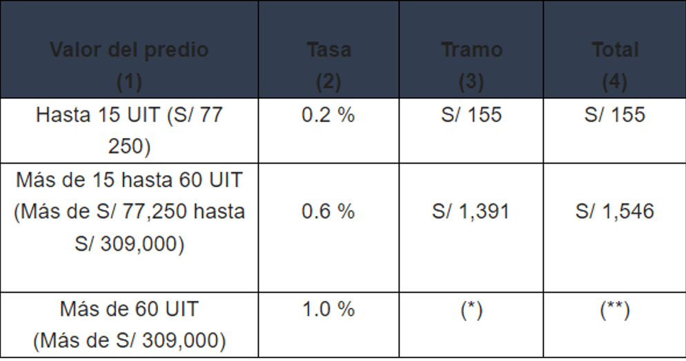 (*) Lo que resulte de aplicar el 1 % al resultado de restar S/ 309 000 al valor del predio