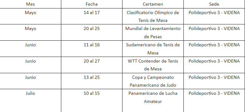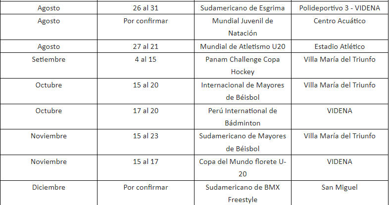 En el calendario deportivo del 2024 también figura el Sudamericano de Tenis de Mesa, del 11 al 16 de junio; el Sudamericano de Esgrima, del 26 al 31 de agosto; el Sudamericano de Béisbol, del 15 al 23 de noviembre; y el Sudamericano de Bmx Freestyle, en la sede Legado Costa Verde, en el distrito de San Miguel.