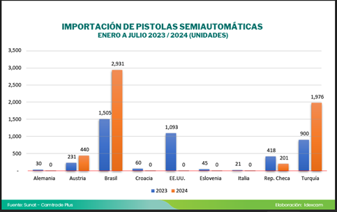 En dicho periodo, las armas de mayor demanda fueron las pistolas semiautomáticas con 5548 unidades valorizadas en 1 421 132 de dólares, lo que representó un aumento de 29 % en cuanto a la cantidad importada, conforme a los datos de la Superintendencia Nacional de Aduanas y de Administración Tributaria (Sunat) analizados por el Idexcam.