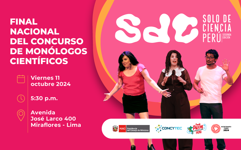 El Consejo Nacional de Ciencia, Tecnología e Innovación (CONCYTEC) presentará el viernes 11 de octubre, a las 5:30 p.m., la final nacional del Certamen de Monólogos Científicos ‘Solo de Ciencia Perú’ (SdC-Perú). El evento, de ingreso libre, se realizará en el Palacio Municipal de Miraflores (avenida José Larco 400, Miraflores – Lima), y reunirá a científicos de 4 regiones, quienes han aceptado el reto de comunicar en tan sólo 3 minutos, la ciencia que desarrollan, a través de una innovadora metodología.