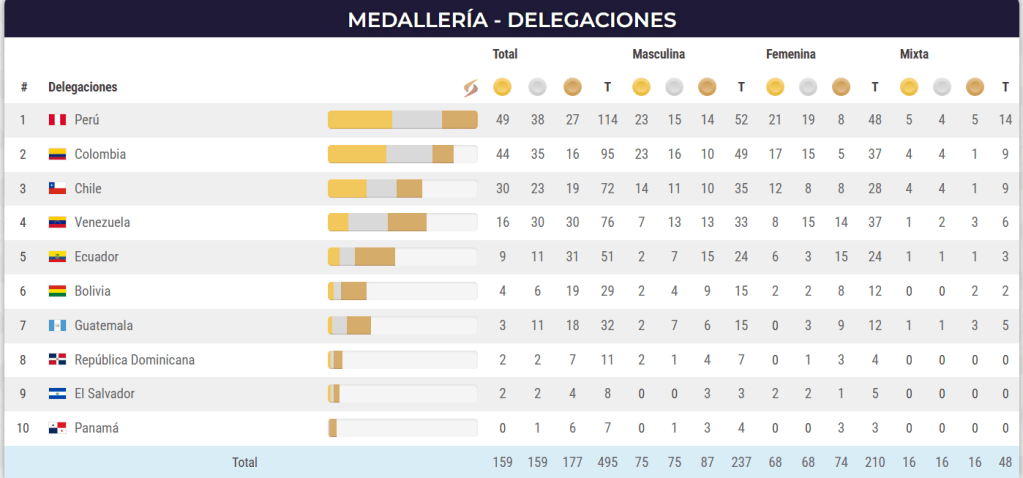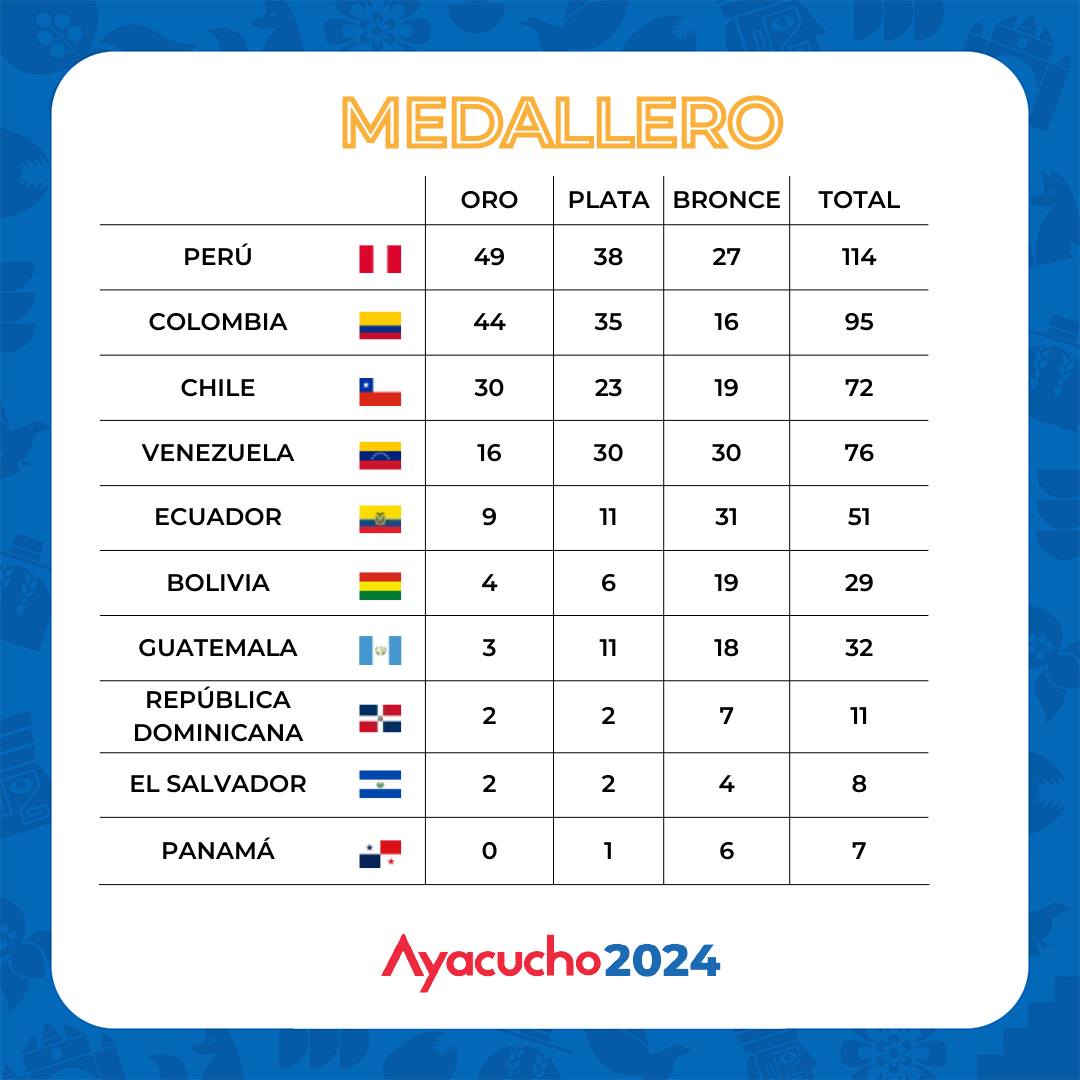 El Team Perú logró el primer lugar de la clasificación con un total de 114 medallas: 49 de oro, 38 de plata y 27 de bronce, superando al ganador de las últimas 3 ediciones, Colombia (44, 35 y 16) y al Team Chile quien se quedó con el tercer lugar (30,23 y 19).