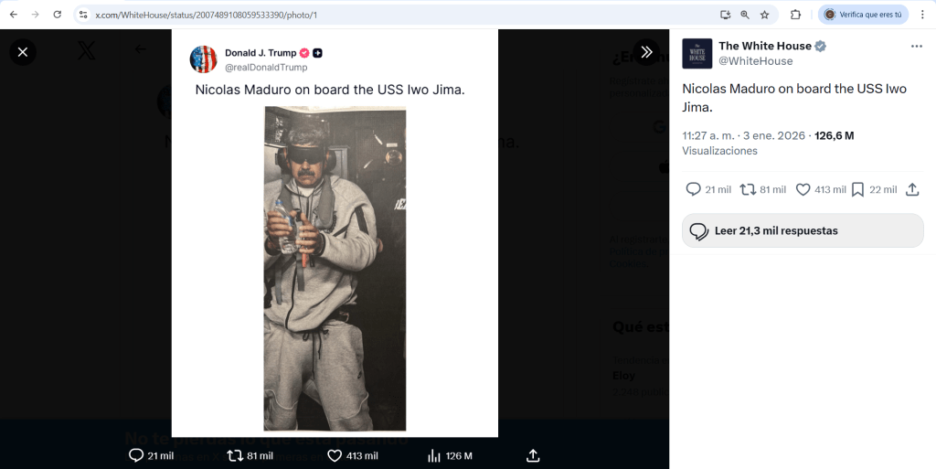 Captura de Maduro en Venezuela por parte de Estados Unidos: Primera imagen publicada por el presidente de EE.UU., Donald Trump: