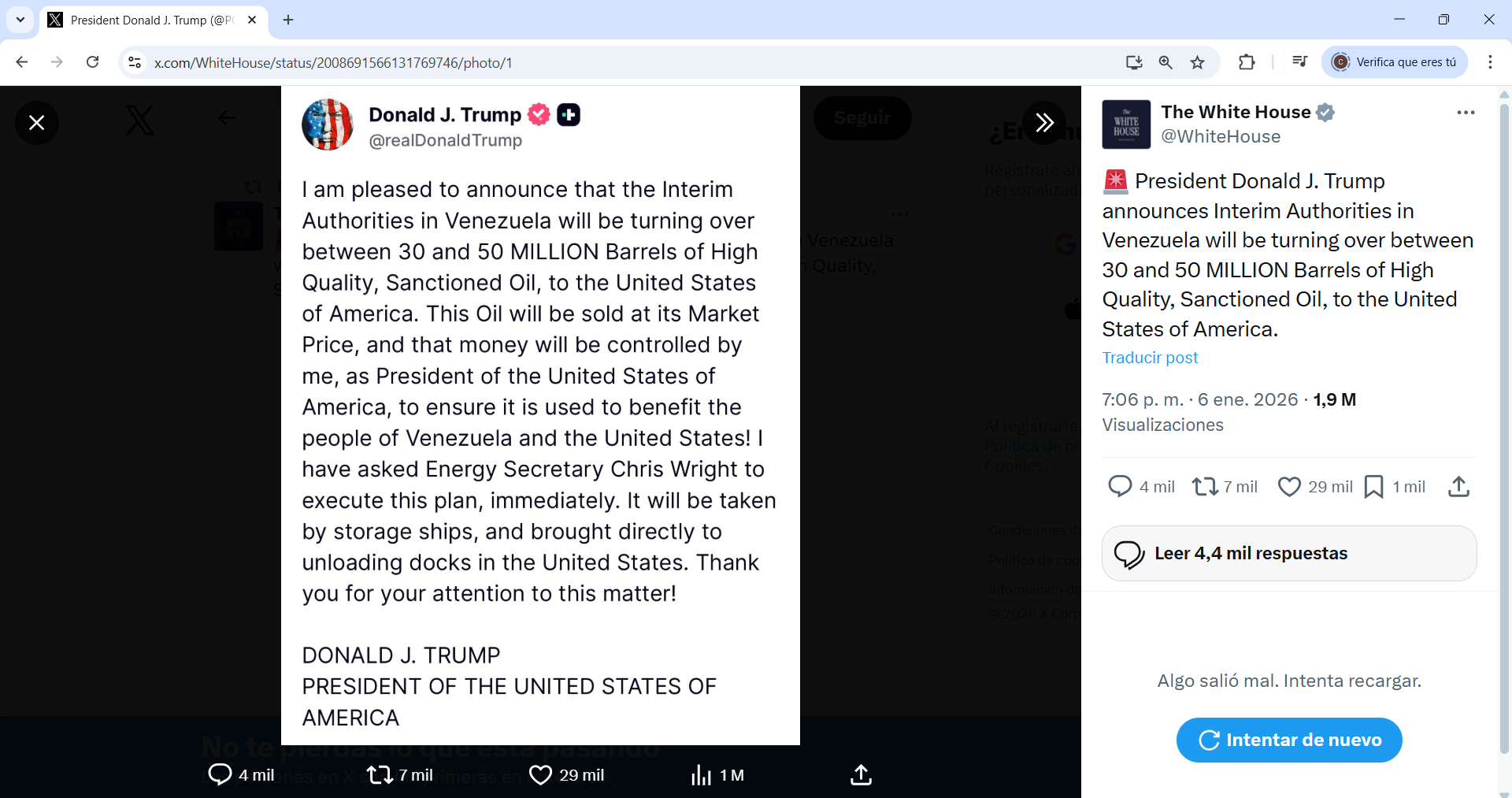 5 de enero 2025 Pronunciamiento en la red social X de María Corina Machado, vicepresidenta del presidente electo de Venezuela el 28 de julio 2025, Edmundo González. Envía mensaje al presidente de EE.UU, Trump, que Venezuela bajo su presidencia, cooperará con los intereses de Estados Unidos respecto al petróleo, que es el tema medular que Trump mencionó antes y tras la captura de Nicolás Maduro, recobrar el robo de petróleo a EE.UU por el régimen de Hugo Chávez- Nicolás Maduro.