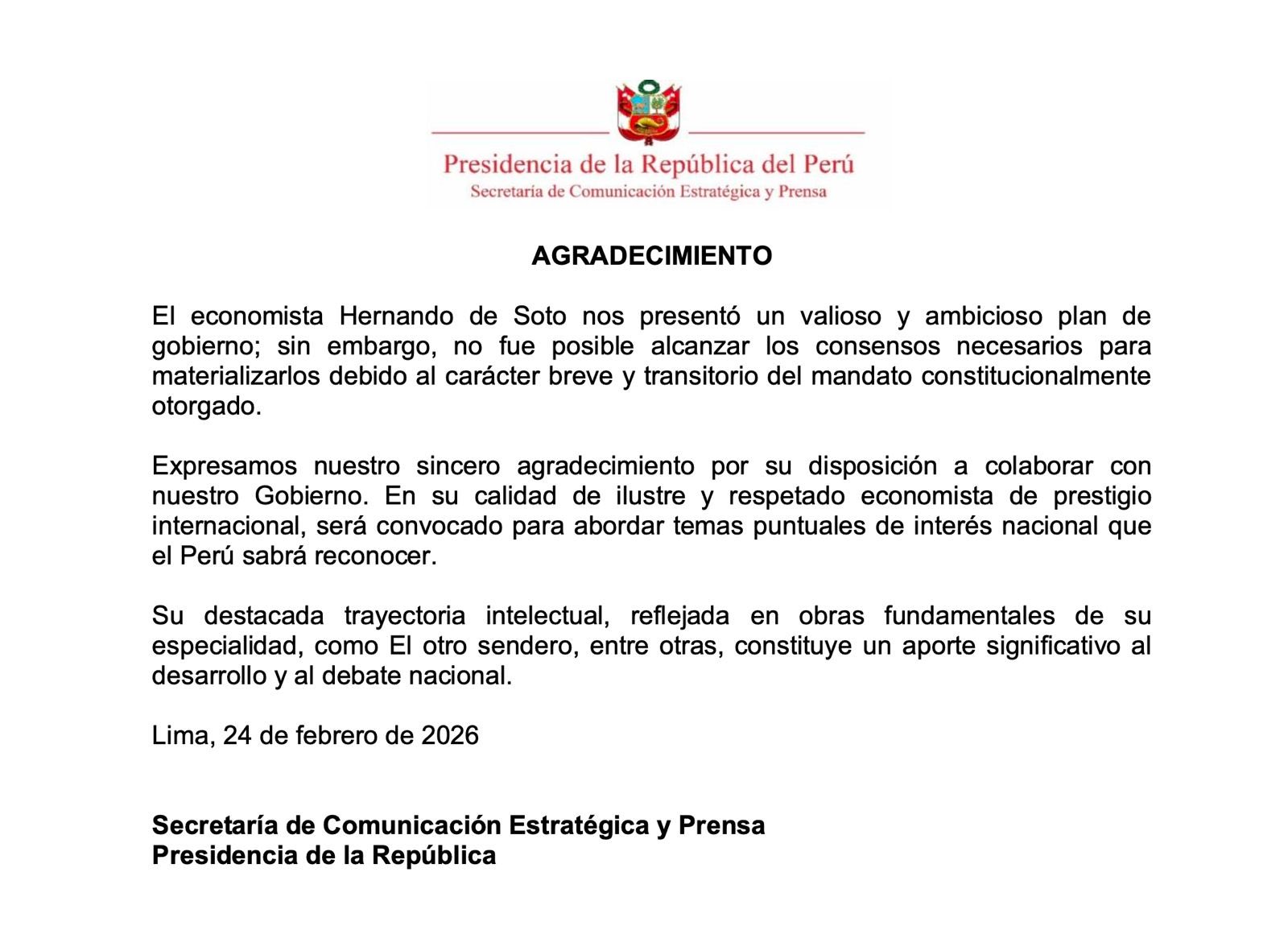 EL PRESIDENTE INTERINO »AGRADECE A HERNANDO DE SOTO» A TRAVÉS DEL COMUNICACDO DE LA PRESIDENCIA DE LA REPÚBLICA DEL PERÚ PUBLICÓ LO SIGUIENTE: